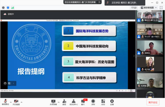 戴民汉院士的报告分别从国际海洋科技发展态势、中国海洋科技发展动向、厦大海洋学科的历史与蓝图、科学方法与科学精神等四个方面展开。