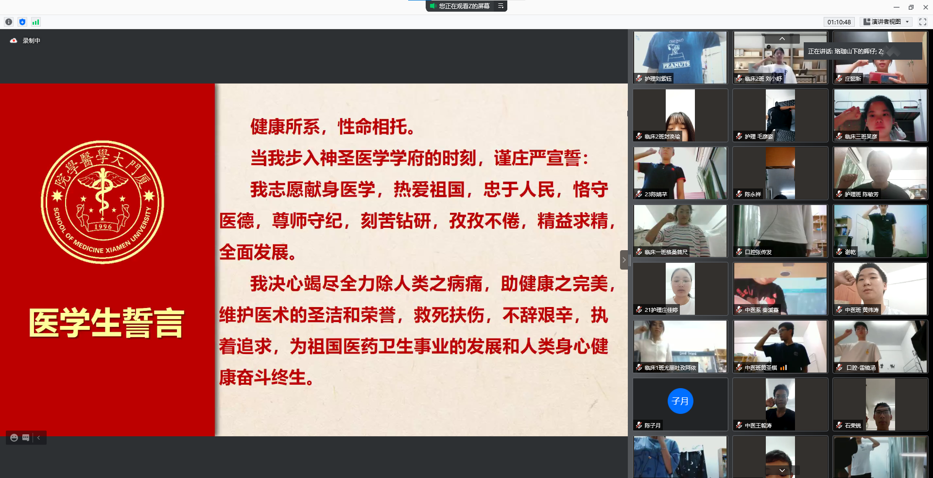 活动伊始,黄正接结合本次抗疫,从“为了谁、如何学、怎么做”分享了作为医学生应承担的使命与责任,他鼓励广大青年学子要努力学习医学知识掌握过硬本领,在国家危难和人民需要的关键时刻挺身而出、彰显担当。张孝斌分享了疫情一线的紧张与艰辛,他表示,“作为一名医生,抗击疫情是他义不容辞的责任。作为一名中共党员,更应该冲锋在前、勇挑重担”。马鑫在分享中指出,面对一个个鲜活的生命,每挽救一个患者就是挽救一个家庭,这让她对医者这份职业也充满了敬畏。她表示,医学是一门富有成就感的事业,这种幸福感耕耘于自己的内心。张楠作为一名在援鄂期间火线入党的共产党员,从武汉到厦门,哪里有需要,哪里就有她的身影。她认为,健康所系、性命相托是医者一生需要谨记的誓言。