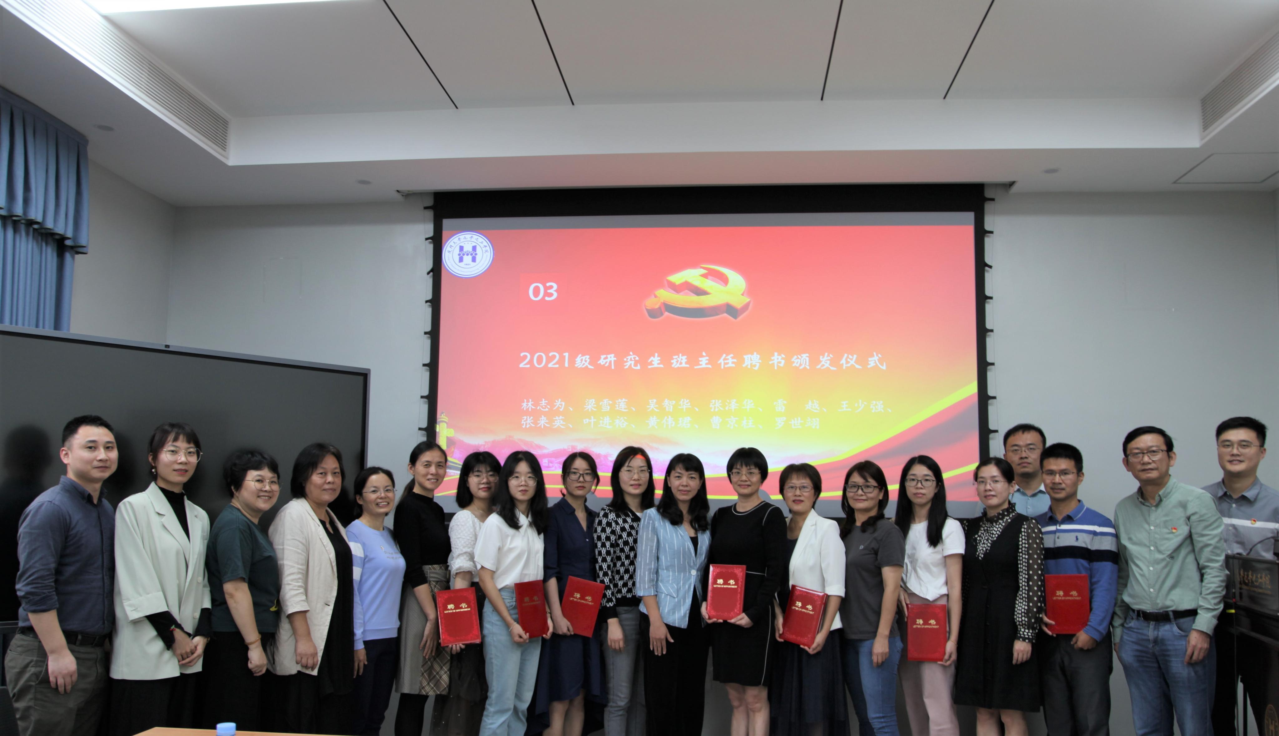 交流会结束后,宋毅与李芬芬为全体2021级研究生班主任颁发了聘书,并与全体研究生班主任、辅导员们合影留念。学院学工组为班主任老师们发放了研究生奖助贷、党建、社会实践等方面相关规定的工作参考资料。