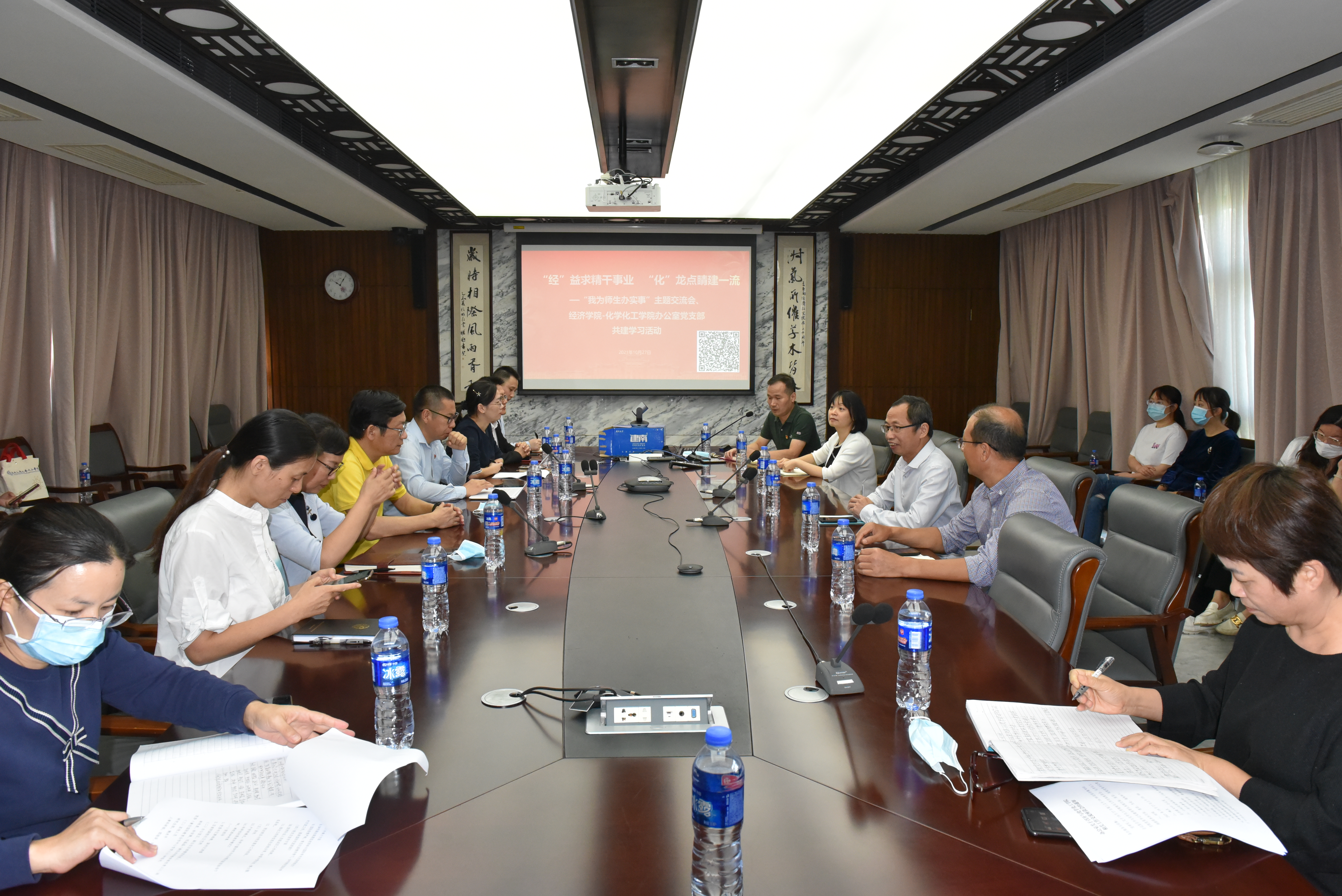 为深入贯彻落实党史学习教育中“我为师生办实事”的行动要求,进一步强化办公室党支部的战斗堡垒作用,有力支撑学院新一轮“双一流”建设工作的高质量发展,10月27日,经济学科与化学化工学院在经济学院N501会议室联合开展“我为师生办实事”主题交流会暨办公室党支部共建学习活动,活动主题为“‘经’益求精干事业、‘化’龙点睛建一流”。经济学院党委书记黄鸿德、党委副书记杜海林、王亚南经济研究院副院长王艺明、经济学院办公室主任兼党支部书记林秋泉、王亚南经济研究院办公室主任余安旖,化学化工学院党委书记宋毅、副书记刘俊杰、副院长陈晓兰、办公室主任兼党支部书记林清育,以及双方支部党员代表等共计30余人参加活动。