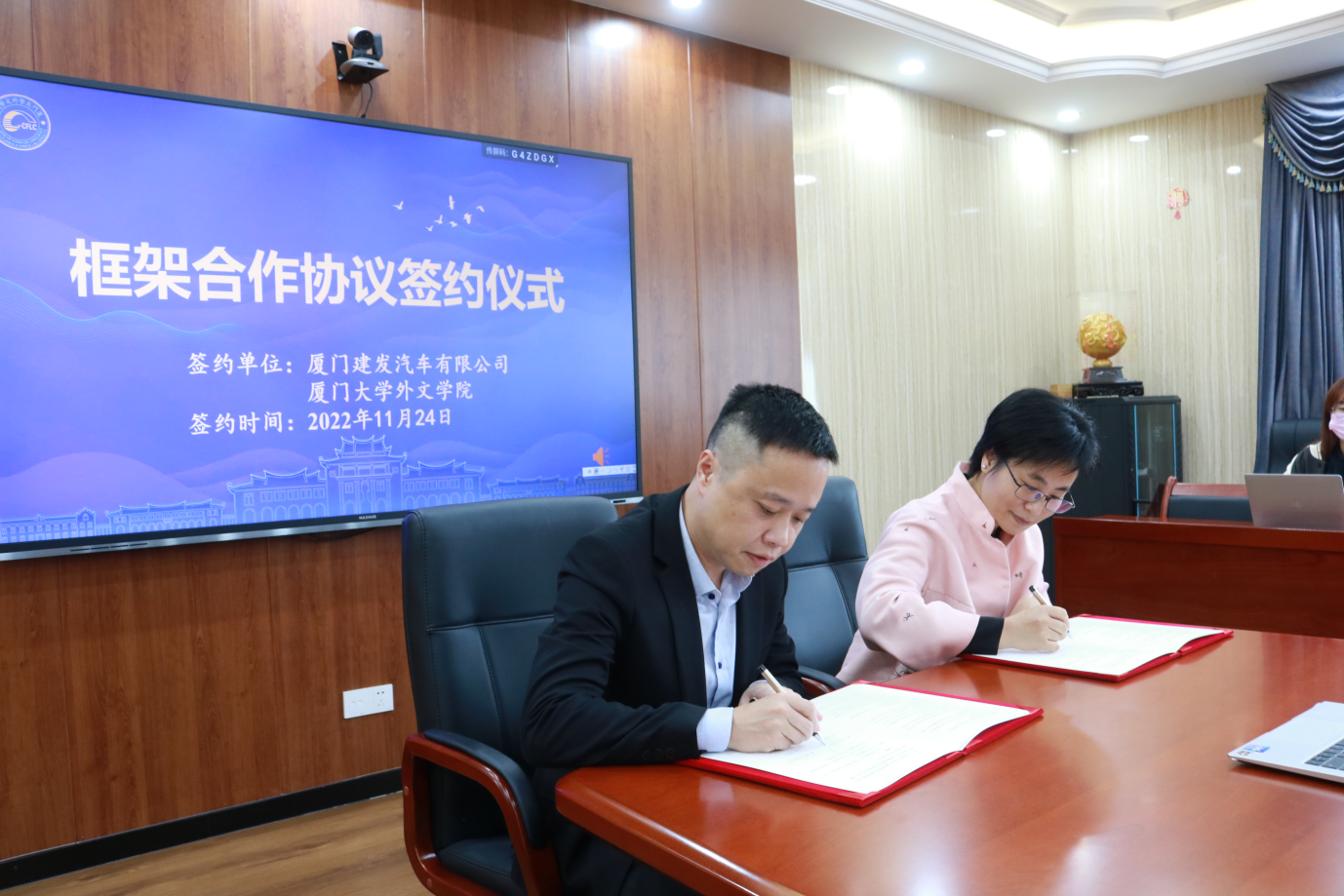 11月24日上午,外文学院与厦门建发汽车有限公司举行合作签约仪式,双方围绕复合型人才培养、学生就业实习等内容,签订框架合作协议,建立战略伙伴关系。建发股份总经理助理、建发汽车总经理、93级外文院友黄卫平,建发股份人力资源部、建发汽车人力行政中心部门负责人,校学生工作处、教务处、国内合作办公室以及学院相关负责人等参加签约仪式。