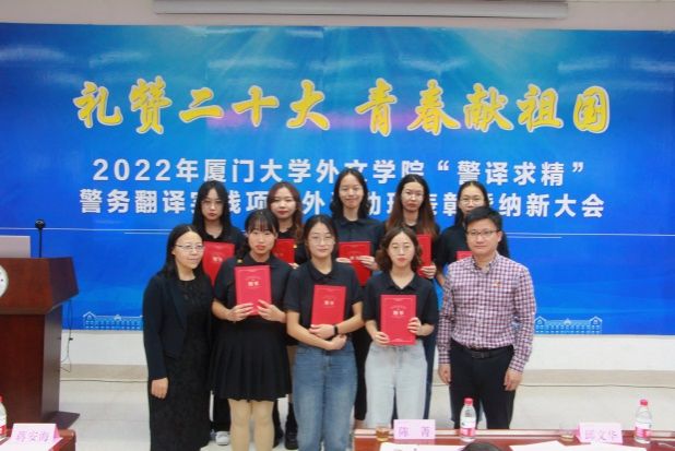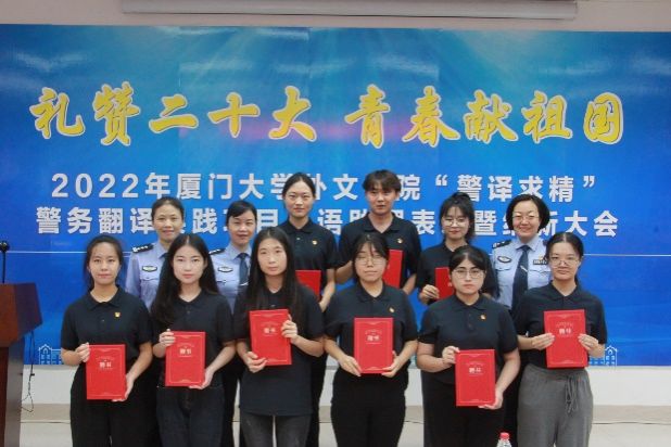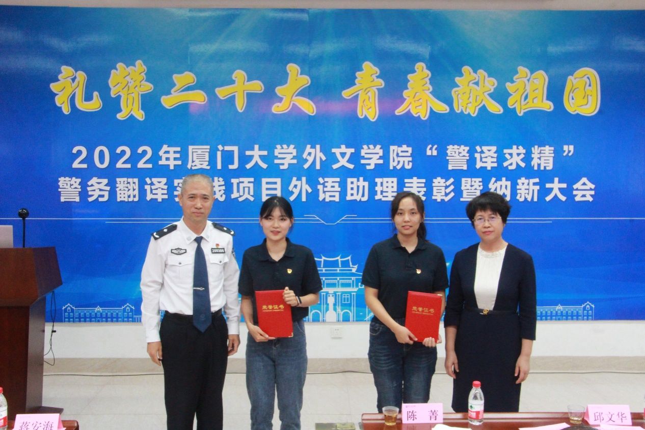 11月24日下午,“礼赞二十大 青春献祖国”外文学院“警译求精”警务翻译实践项目外语助理表彰暨纳新大会在德贞楼112报告厅举行。厦门市公安局出入境管理局,厦门大学研究生院培养与管理办公室、外文学院等相关单位负责人出席活动。