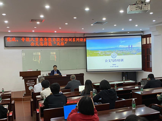 11月29日下午,该系列讲座的第一讲邀请了厦门大学办公室副主任马进龙老师以《公文怎样能“及格”》为题,畅谈公文写作“及格”方法,为三院党政、专技人员上了一堂内容详实、精彩生动的公文写作课。讲座由教育研究院党委姚有新副书记主持。