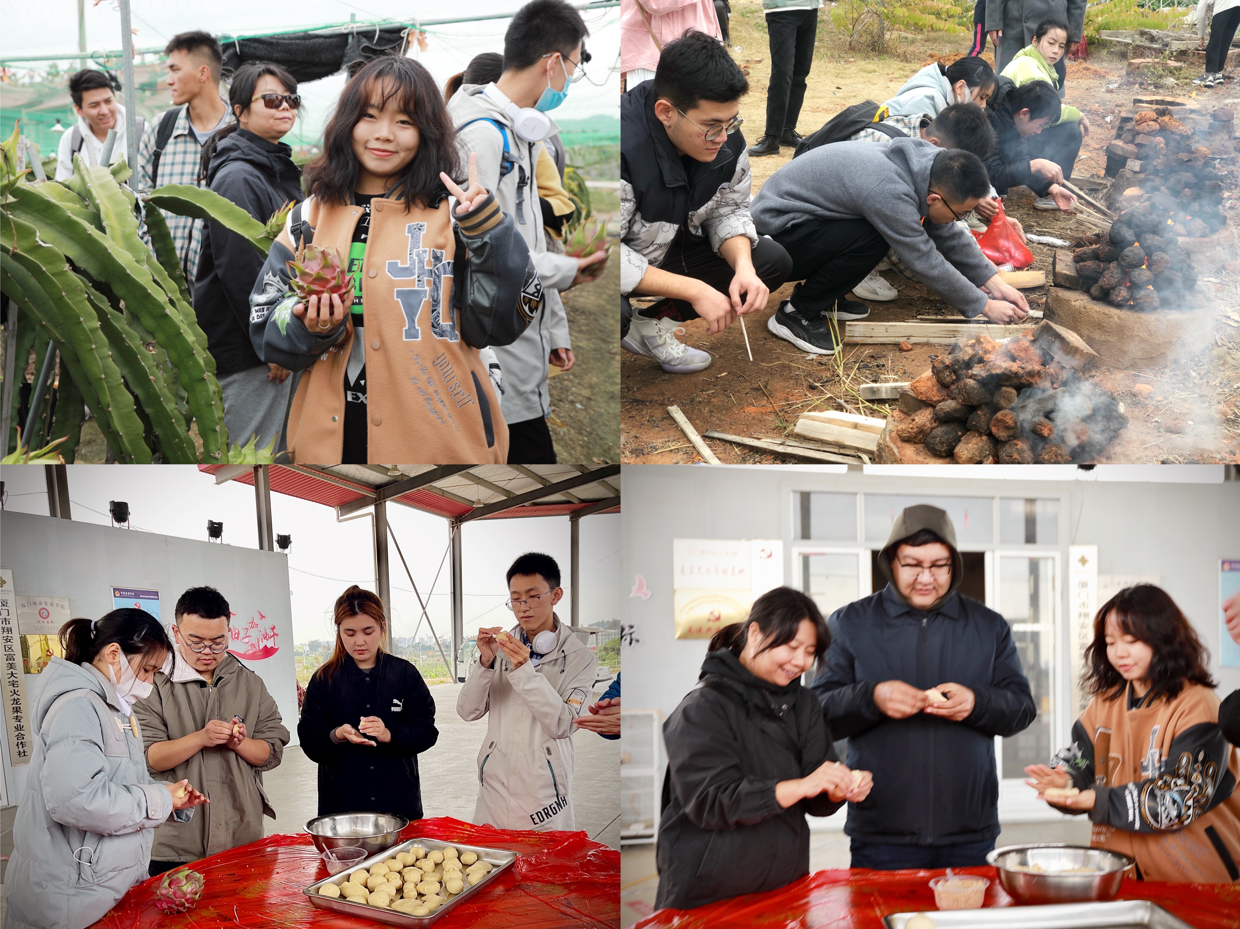 除了在田间地头学习鲜活党史之外,厦大“石榴籽”们还跟随大宅村民参观火龙果田和火龙果育种培养基地,向当地农民了解火龙果的生长环境、种植技术和品种等知识,并进行火龙果采摘、土灶生火等农事体验,在劳动实践中体会美好生活的来之不易。“自己动手,丰衣足食”。在少数民族辅导员艾孜麦提江·吉力力和新疆内派教师高燕的带领下,“石榴籽”们学会了制作闽南特色小吃——炸枣,将事先准备好的花生碎放入糯米粉团中,收口搓圆,捏成枣的形状后油炸,外酥内韧、香甜可口的炸枣让大家直呼“美味”。“石榴籽”们在品尝传统美食中体味闽南文化,进一步增加了中华传统文化认同感。