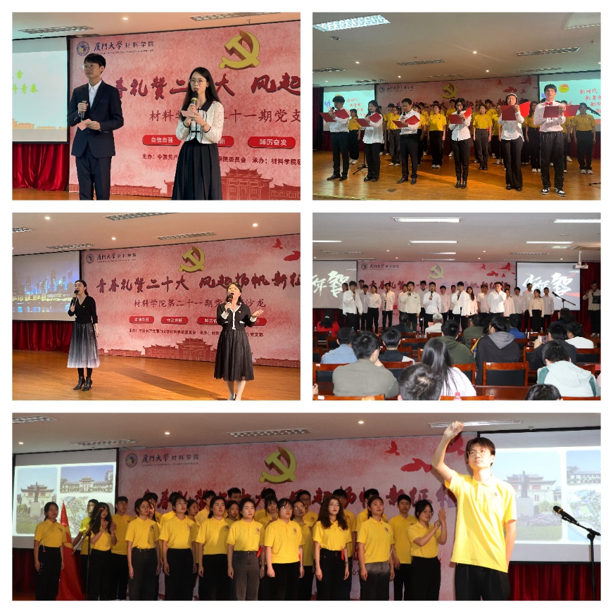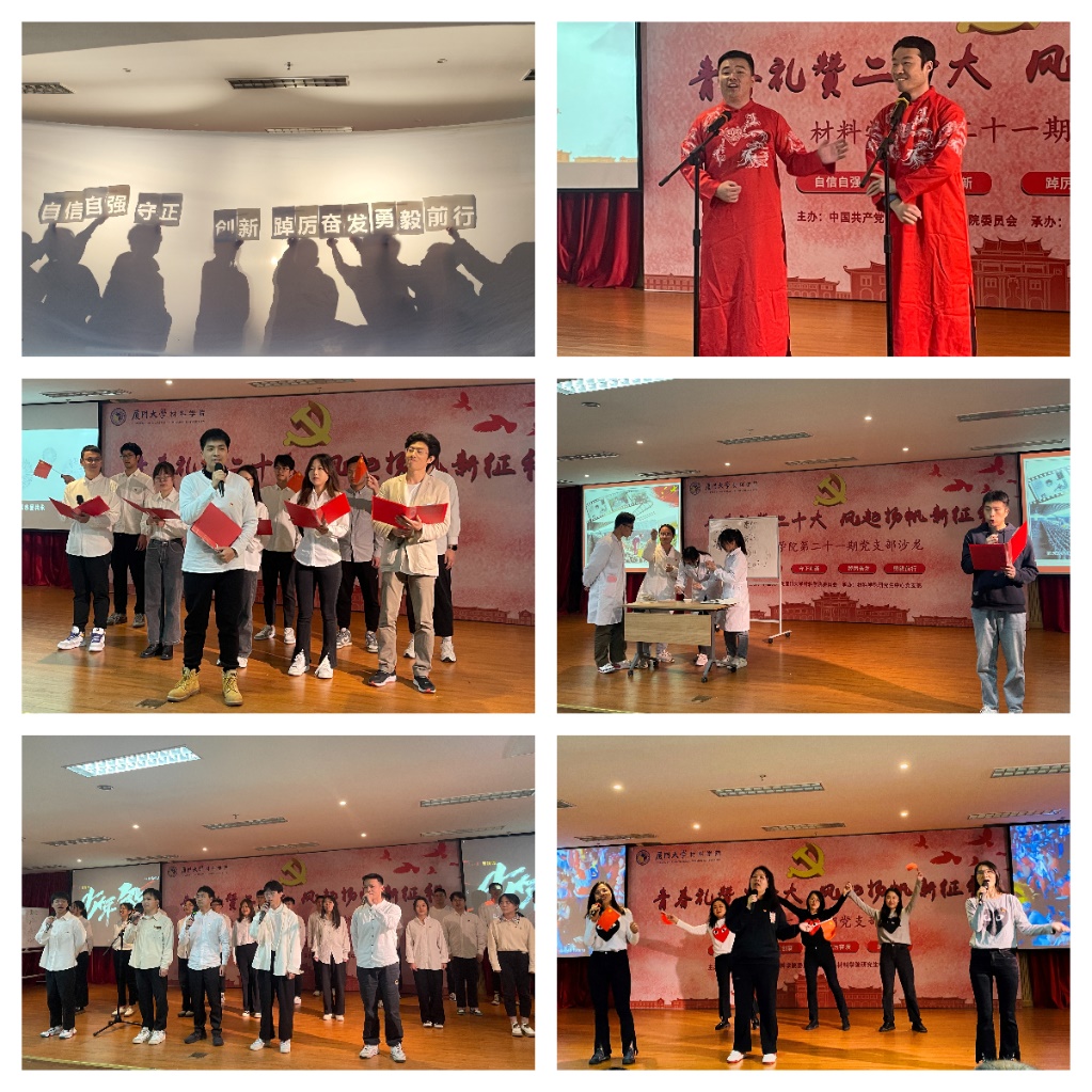 本次党支部沙龙以“青春礼赞二十大 风起扬帆新征程”为主题,分为“回顾峥嵘岁月”“壮哉中国力量”“少年青春奋斗”三个篇章。本科生党支部的光影剧《铭记百年 “材”向未来》用光影带领师生回顾了建党百年的艰辛与代代共产党人的奋斗历程;2020级硕士生第三、第四党支部、2019级、2022级博士生党支部用故事演绎《二十大代表故事汇》,展现了以林占熺、刘秀祥为代表的二十大代表们在平凡的生活中所展现的不平凡;2020级博士生党支部和金属材料教工党支部带来的相声《培养党员》通过“爱、严、变、帮”四个关键字讲述了党员培养的重要性;特种材料教工党支部、2022级硕士生第三、四党支部带来的合唱朗诵节目《簇材为薪,笃当复盛》唱响了强国路上材料学子的使命与担当……全体师生党员以讲促学、以演体悟,共享学习盛宴。