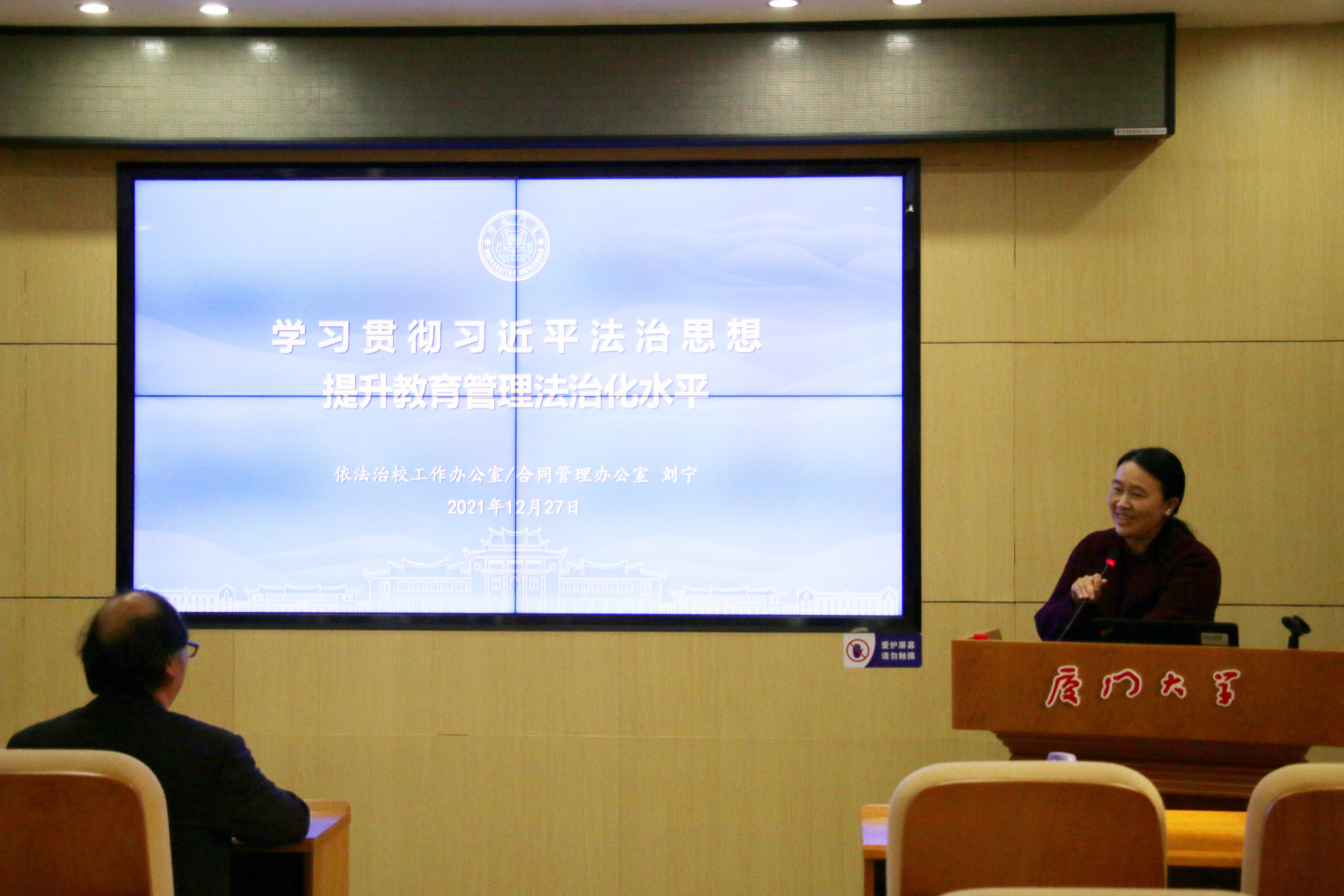 2021年12月27日下午,公共事务学院联合教育研究院、国际关系学院/南洋研究院在联兴楼207举办了党政、专技人员业务能力提升培训系列讲座第四讲。本次培训主题是“学习贯彻习近平法治思想,提升教育管理法治化水平”,邀请了学校依法治校工作办公室/合同管理办公室主任兼学校办公室副主任刘宁为三院师生授课。