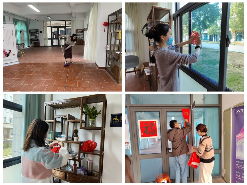 劳动过后,看着一抹抹红色点亮了共享空间,平日里学习工作的场所变得分外添彩,2021级汉语国际教育硕士肖婧宸满是欣喜,她表示:“虽然一下午的劳动虽然有点累,但看到共享空间变得焕然一新,为大家增添了节日的气氛,我们便感到十分的快乐和满满成就感。”