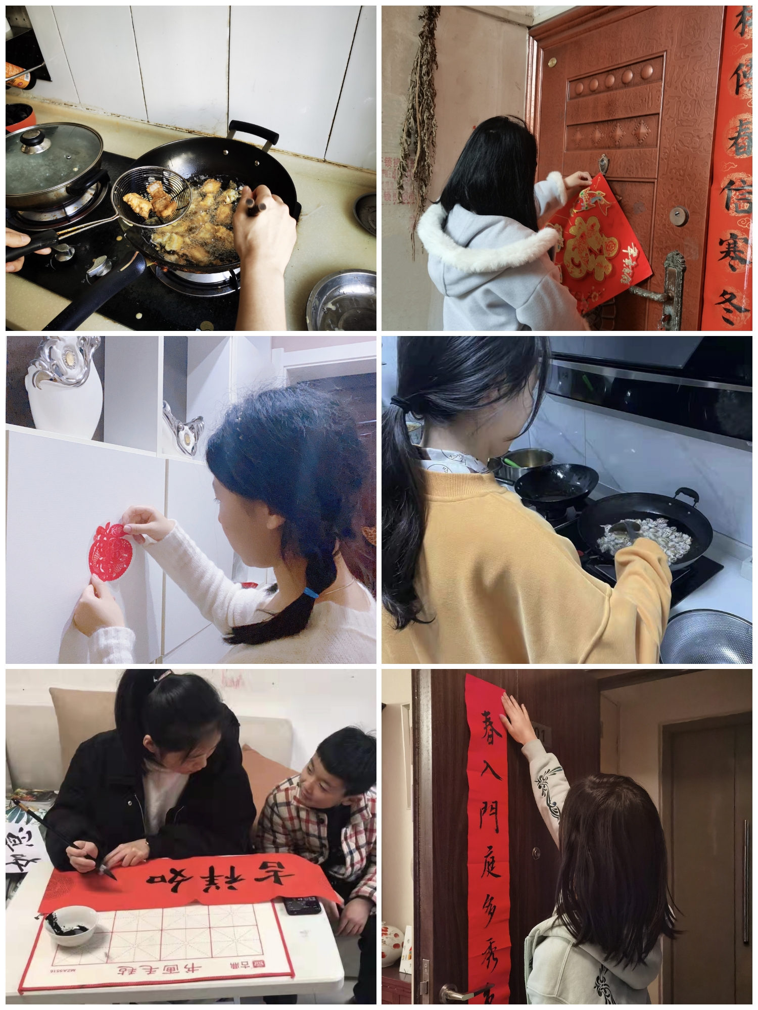 返乡学子在家进行力所能及的家务劳动,有的打扫卫生、除去旧尘,扫出一个清新整洁的小屋;有的操刀舞铲,化身“中华小当家”,亲手为家人下厨做菜,炒出一桌秀色可餐的年夜饭;有的爬窗登梯,贴窗花、挂灯笼、写春联,布出一家虎味浓郁的新装。“虎步奔腾开盛景,春风浩荡展宏图”,还有的同学挥毫泼墨,用墨笔抒写一副对祖国的美好新年祝福。