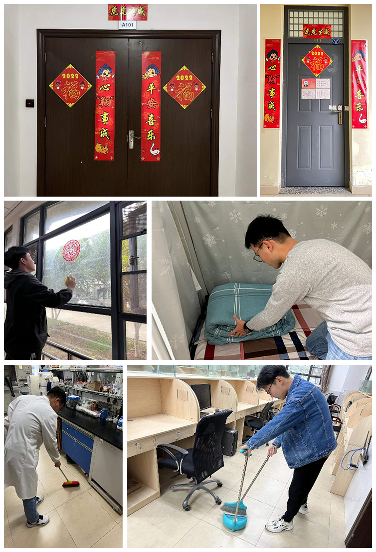 为弘扬优秀中华文化传统,营造浓厚的中国年味和春节喜庆氛围,也为了让同学们体验劳动的快乐,教育引导同学们崇尚劳动、尊重劳动,1月25日,我院组织留校同学在宿舍、实验室、研究生工位等开展“除尘布新”迎新春活动。伴着冬日的暖阳,留校同学整理桌面、擦试验台、打扫和拖地板……将研究生工位、实验室和宿舍的角角落落进行了细致打扫,让每一丝灰尘都无所遁形,再在门框上张贴“福”字和春联,喜气洋洋地迎接新春的到来。