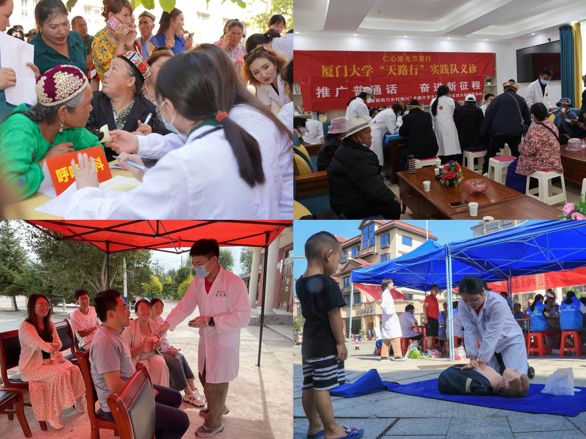 开拓“专业赋能”新路,践行仁心为民。习近平总书记强调:“当代中国青年要以聪明才智贡献国家,以开拓进取服务社会。”医学院用心打造“行走的思政课”,引导医学青年学生树立担当意识、服务意识、奉献意识,在社会实践中发挥专业优势,融入国家战略,以实际行动践行医者仁心。2023年,医学师生实践队赴西藏拉萨、林芝、新疆阿克陶、宁夏隆德、广西防城港、福建光泽等省内外16地,将所学专业与当地需求紧密结合,通过开展义诊送药、健康宣教、疾病调研、医疗帮扶等实践活动,投身乡村振兴、助力健康中国建设,累计服务群众2万余人次,引导学生实现由“知”到“行”的升华。深耕十年的“天路行”实践队扎根雪域高原,从路遇泥石流扛仪器进村的意外到停电秉烛整理数据的艰辛,累计服务当地10个乡镇73个行政村2万余名牧民群众,让100余名医学生擦亮学医初心,也吸引了一批批有志青年毕业后赴藏施展才干;三次入宁的“情系隆德”实践队、走进南平光泽的“医路向光”实践队投身对口帮扶工作,关注老年人健康,送医上门,走访调研100余户,在调研与服务中厚植家国情怀;二度赴疆的“仁心暖疆”实践队聚焦当地多发的肺结核病,在公安局、镇卫生院、社区集市等地开展义诊送药、科普宣传,派送药品20余类,服务群众400余人次。来自当地群众的“希望你们明年再来!”是对实践队员辛勤付出的最大肯定。