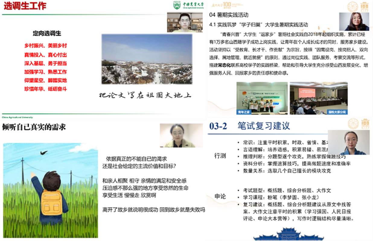 与会四位嘉宾结合自身经历,向大家分享了自己的考选经验。毕业于中国农业大学现就职于山西省农业农村厅魏旭超,从山西省选调政策、考试形式流程、时间、岗位选择、体检要求、信息来源、待遇等方面为大家详细讲解了定向选调,并鼓励大家积极投身家乡建设。毕业于厦门大学现就职于沂州市行政审批服务管理局王子君,结合自身经历,生动分享了选调上岸感受、工作日常、备考心路历程等,勉励在场的学弟学妹勇于担当、增强本领。毕业于厦门大学现就职于沂州市农业农村局赵莉,为同学们充分解读了山西省的考情、报录比、难度分析、专业契合度等,鼓励大家尽早开展职业规划并明确自身职业定位。毕业于北京大学现就职于太原市文物局袁颖,从自身感受出发,给同学们详细介绍了工作选择方面的注意事项,为决定考公的在校生分享了备考建议,并鼓励大家多做现实思考,倾听自己内心的需求。