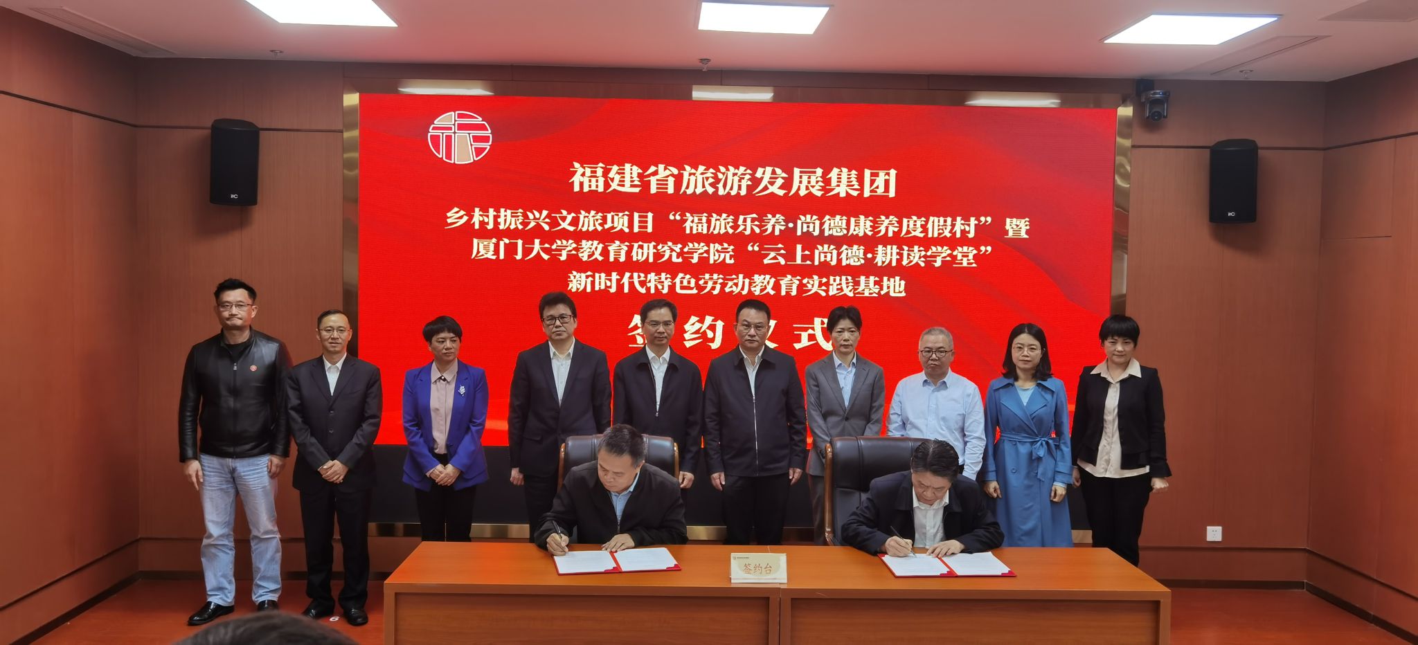 别敦荣代表厦门大学教育研究院与福建省福州市闽清县桔林乡尚德村、福建中旅集团有限公司签署了“云上尚德·耕读学堂”劳动教育实践基地共建协议书,三方代表共同见证了这一美好时刻。根据协议,三方应本着资源共享的原则,在人才培养、教学科研、项目研发等多方面进行广泛合作。