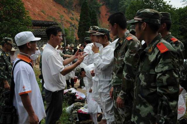 王灵岚向救灾官兵讲解防护服穿戴要领
