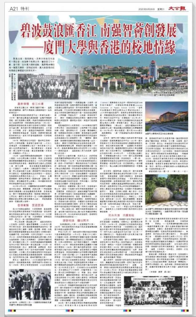早在1956年1月,高教部与中侨委商定同意厦大创办华侨函授部,4月10日,香港《大公报》《文汇报》在第一版用特号字标题刊登厦大筹办华侨函授消息。厦大华侨函授部成立之初设数学、物理、化学三个专修科,后又增设中国语文、中医专修等科。1963年,开始有香港籍学生就读厦大中国语文专修科。1980年,厦大海外函授部复办,在香港等地设立海外招生代办处,并在香港设立中医临床实习基地,与香港有关单位合作开展中医实习带教工作,培养大批中医人才。大量香港学子通过函授学习,文化知识水平和业务能力得到有效提升。1993年,厦大成立台港澳学生先修部,为台港澳青年学生赴大陆(内地)学习深造提供更多机会……厦大华侨函授部几经更名为现在的厦大海外教育学院,从1956年成立至今,已培养约4300名港籍学生,其中涌现出不少文学界、中医界菁英。1983年,厦大成立新闻传播系,以“传播”冠名,创办广告学专业、国际新闻学专业,开内地之先河。这正是在原香港《大公报》老报人刘季伯先生、新闻前辈徐铸成先生、香港中文大学新闻与传播学系原主任余也鲁教授等的大力提倡和支持下才变成现实。