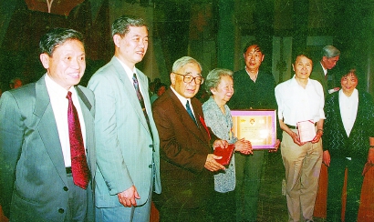 图4.1994年4月6日,厦大建校73周年庆祝大会上,卢嘉锡(左三)、谢希德(左四)和校领导向“南强奖”获得者颁奖