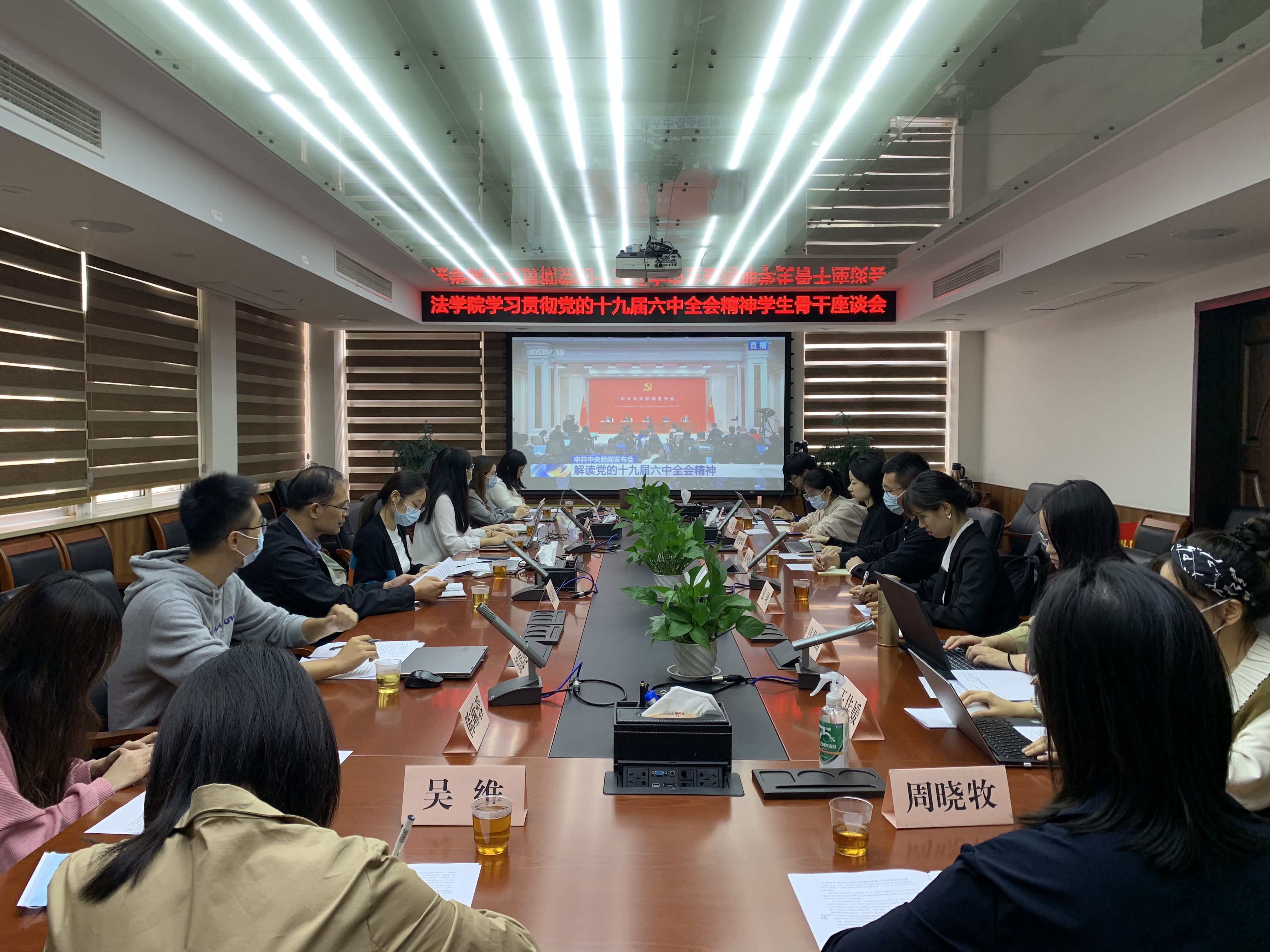 11月12日上午,法学院召开学习贯彻党的十九届六中全会精神学生骨干座谈会,与会师生收听收看中共中央举行的新闻发布会,交流畅谈党的十九届六中全会精神学习体会。法学院党委副书记郭锦星出席座谈会并讲话。会议由法学院团委副书记周晓牧主持。