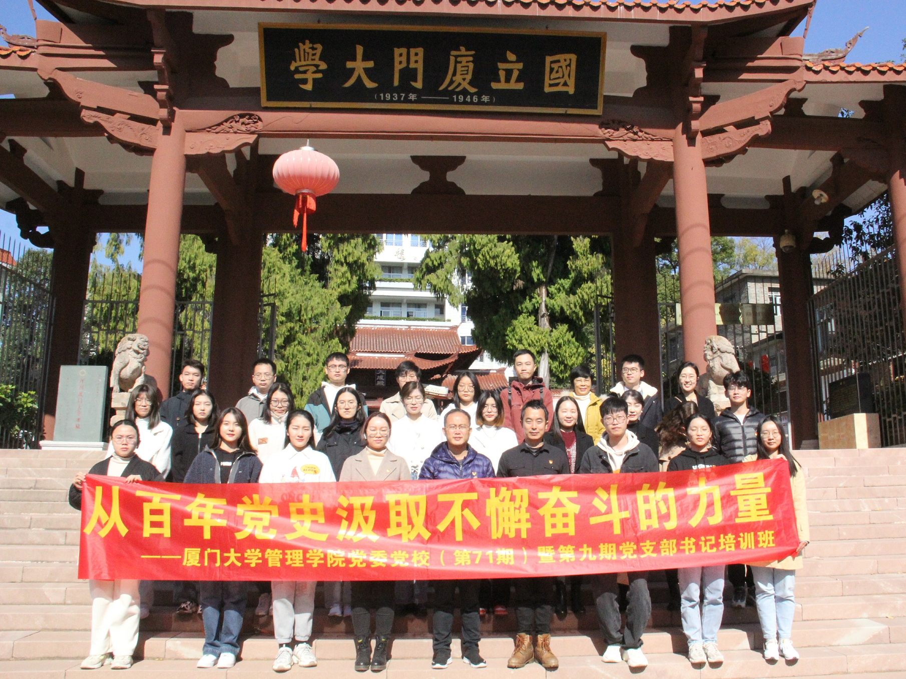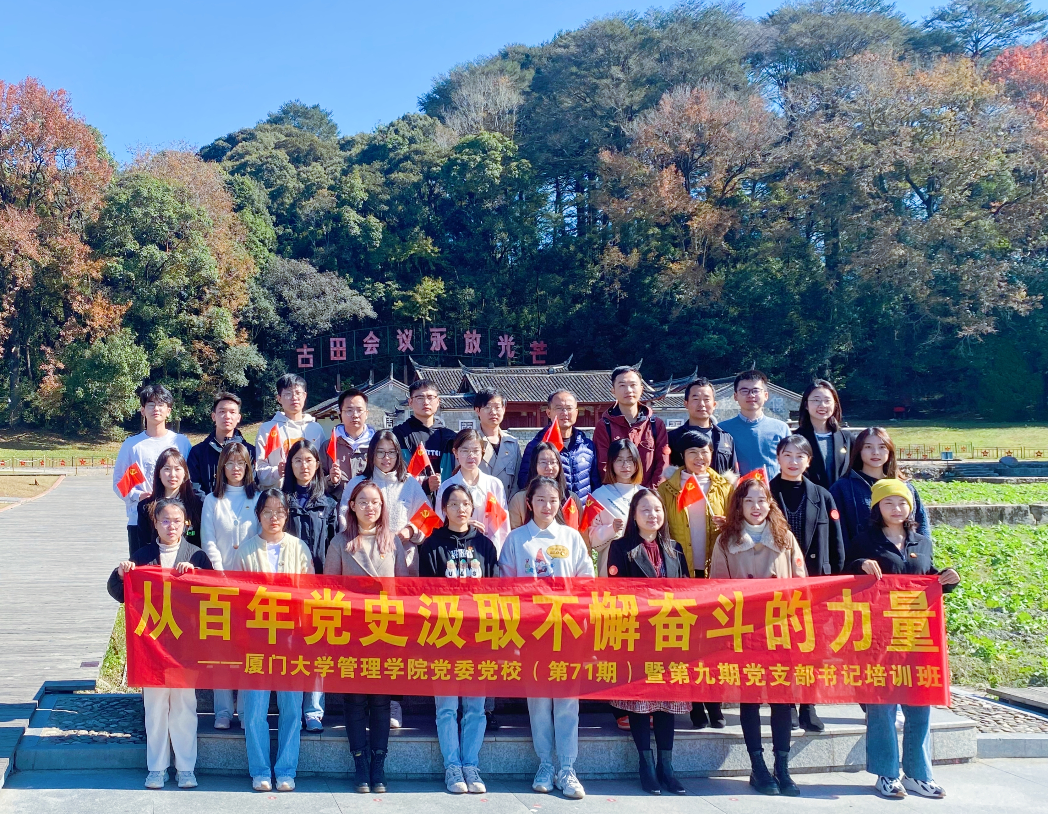 为深入学习党的十九届六中全会精神,12月4日至5日,厦门大学管理学院党委党校第71期培训班暨第九期党支部书记培训班走进古田、长汀开展了为期两天的学习活动,在实地走访中深入学习党史、重温革命历程、挖掘厦大校史。管理学院党委副书记戴蓥、院办公室主任吴光锡、院团委书记蒋超杰、全体辅导员、学生党支部书记参加活动。