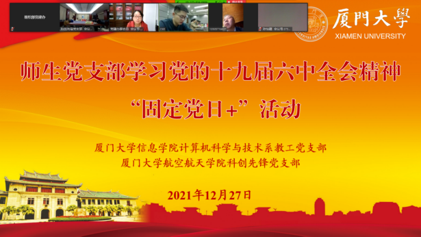 12月27日晚,信息学院计算机科学与技术系教工党支部联合航空航天学院科创先锋本科生党支部举行线上联合“固定党日+”活动,深入学习领会党的十九届六中全会精神。教育部直属高校党建工作联络员陈子辰同志出席线上会议,校党委党建办主任兼组织部副部长、教师工作部副部长廖志丹同志主持参加线上会议。