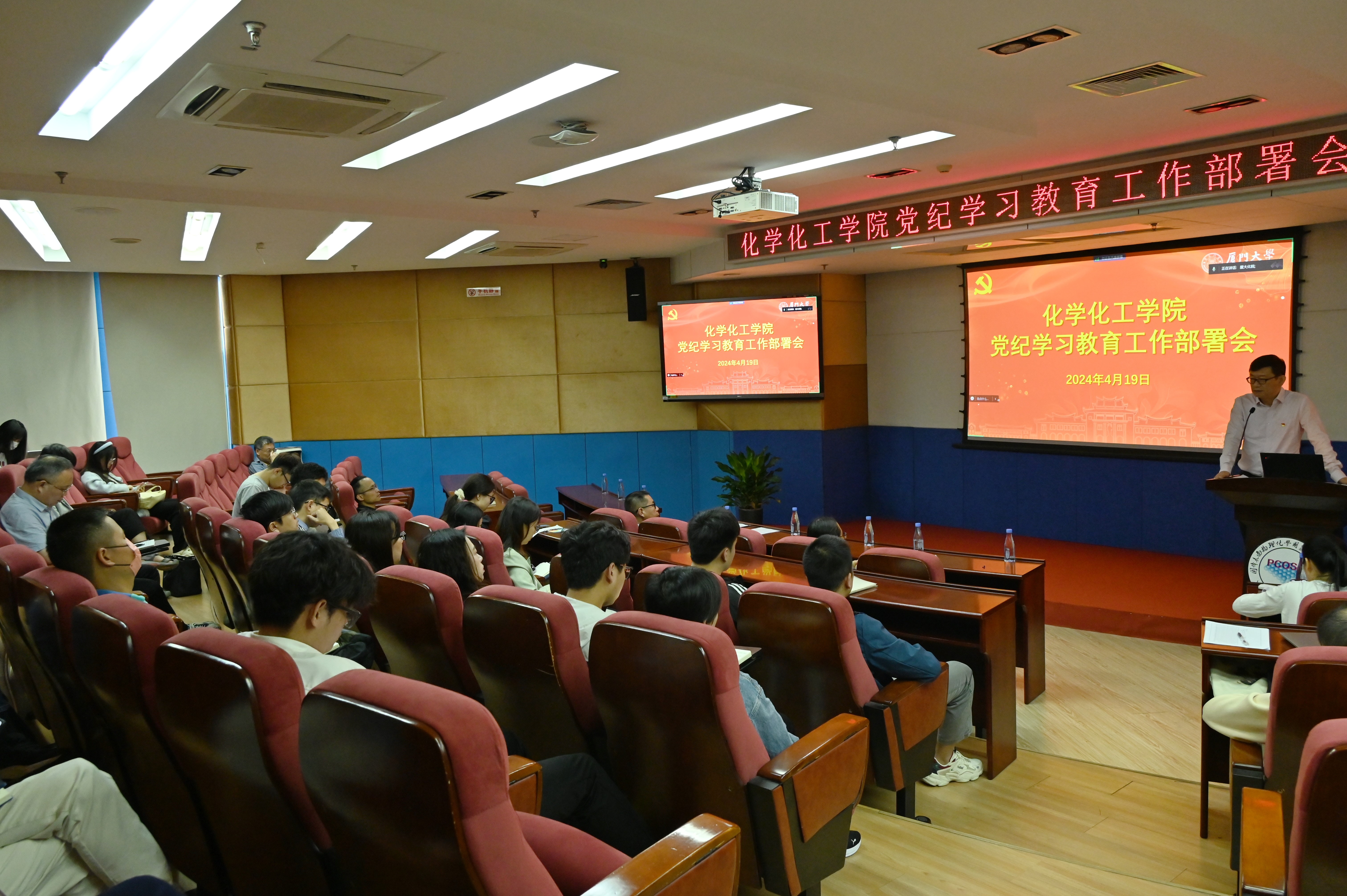 4月19日上午,化学化工学院党委在卢嘉锡楼202报告厅召开党纪学习教育部署会,传达学习习近平总书记关于党纪学习教育重要讲话和重要指示精神,贯彻落实学校党委党纪学习教育部署会精神,并就学院党委开展党纪学习教育工作作动员部署。学院党委书记宋毅,党政领导班子,师生党支部书记、支委,全体辅导员参加会议。